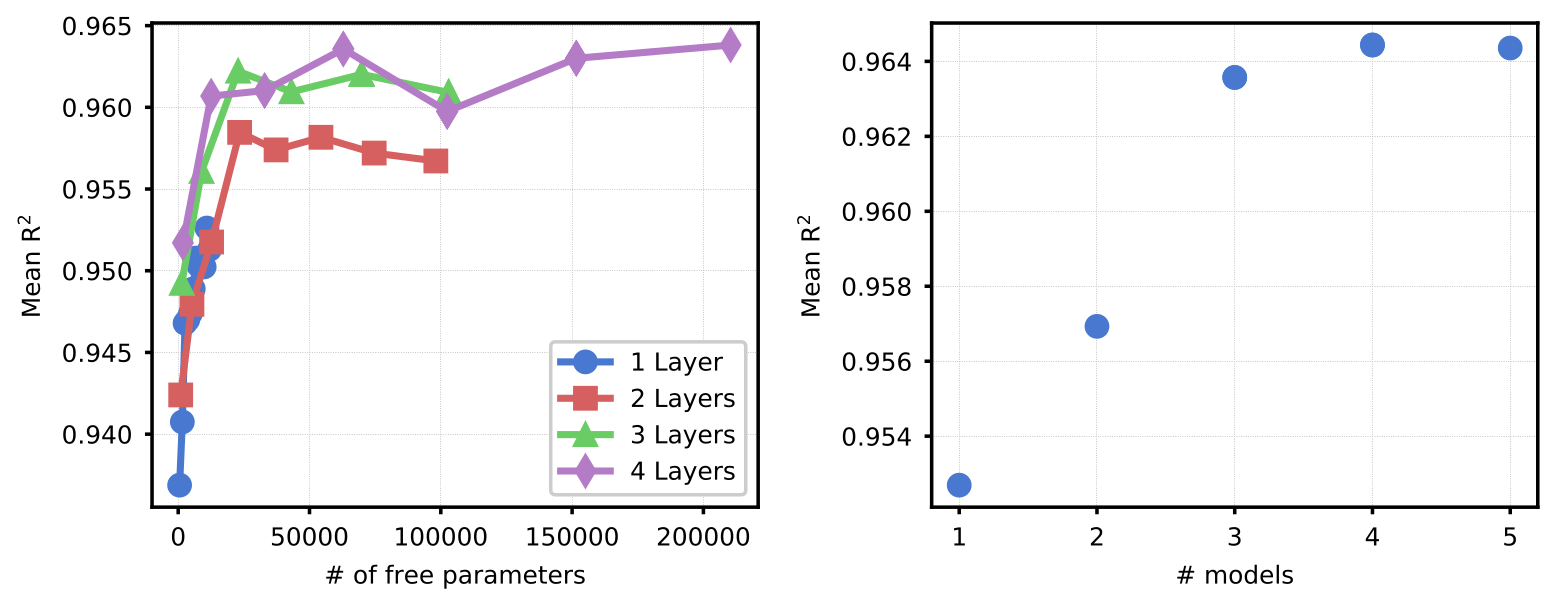 Figure 4. Determining optimal number of NN layers and ensemble size. (left) Model prediction accuracy (on the NSTX-U validation dataset) across potential architectures. Each model consisted of a varying number of hidden layers, each with the same number of nodes per layer. An ensemble of 3 models was used for each case. (right) Prediction accuracy (on the NSTX-U validation dataset) as a function of number of models in the ensemble (for model with 4 layers of 140 nodes each).